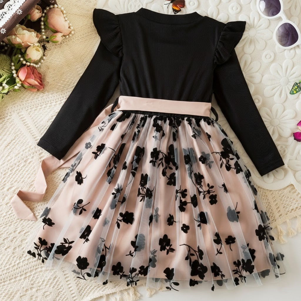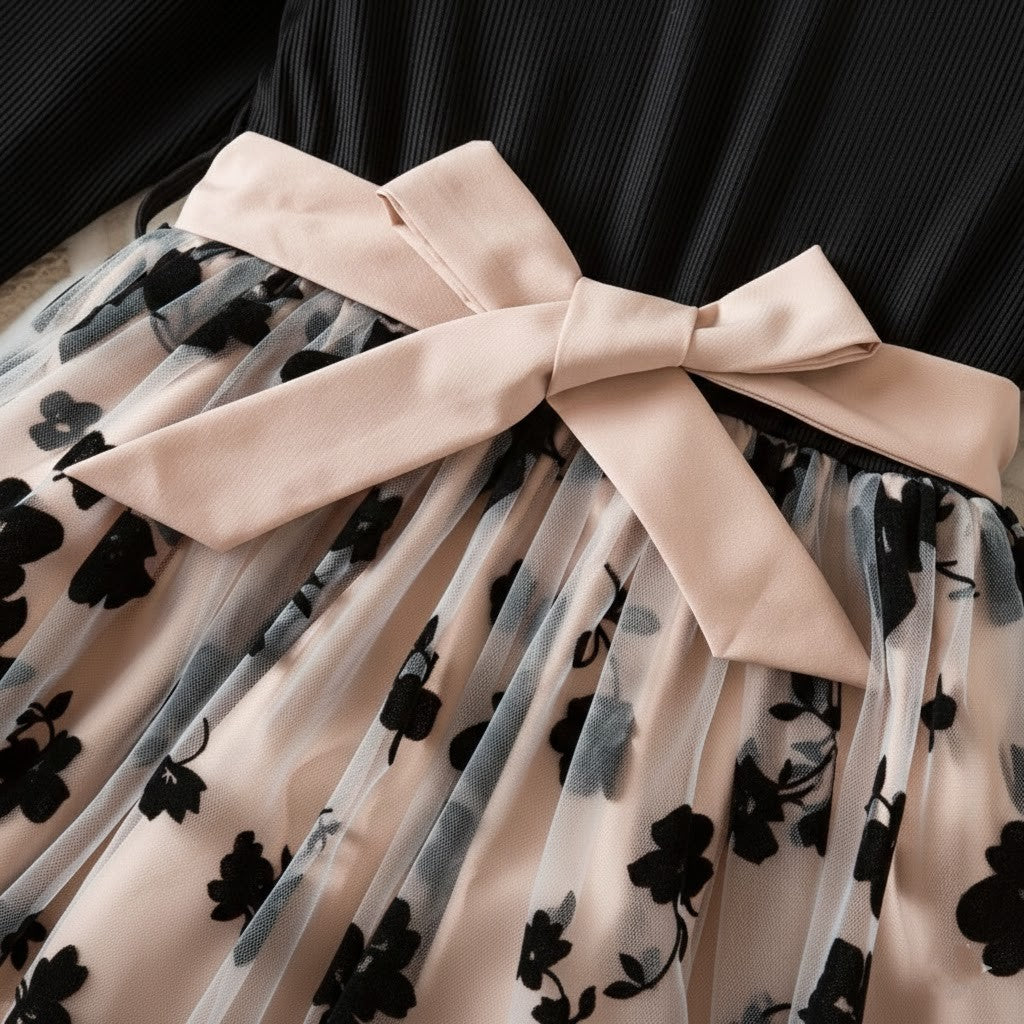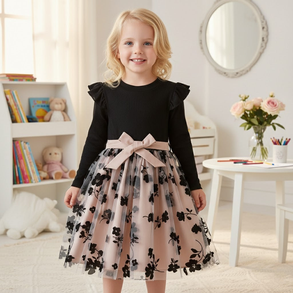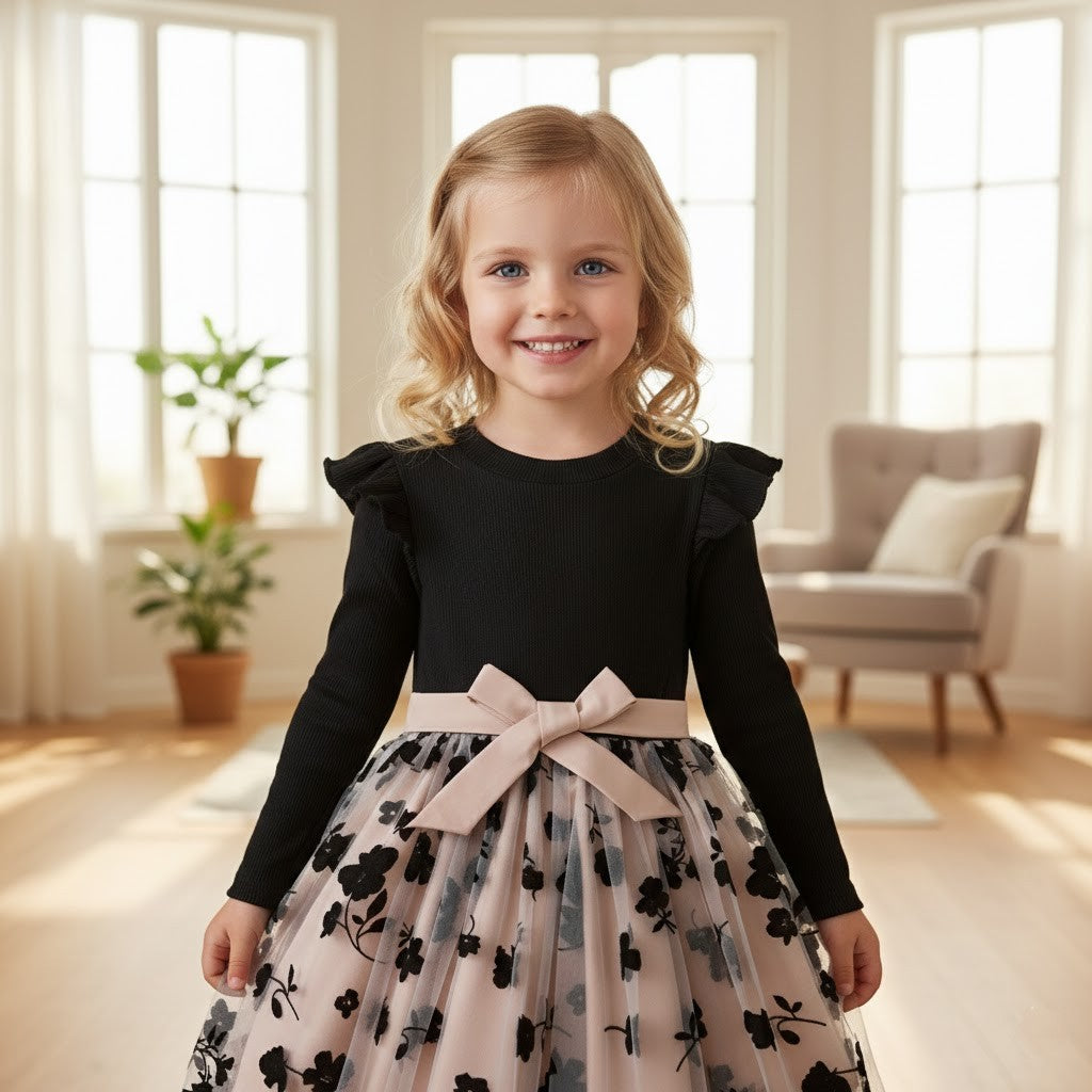 Denna rosé mesh-prinsessklänning är skapad för magiska ögonblick. Med sin sofistikerade färgkombination av djup svart överdel och mjukt roséfärgad meshkjol ger klänningen ett exklusivt och drömlikt intryck. Den luftiga tyllkjolen med diskret blommönster skapar ett vackert fall som rör sig graciöst vid varje steg. Perfekt för barn som älskar att känna sig extra speciella och klä sig som en riktig prinsessa.