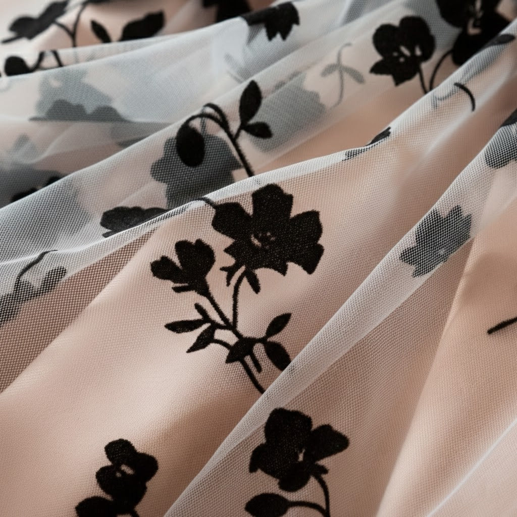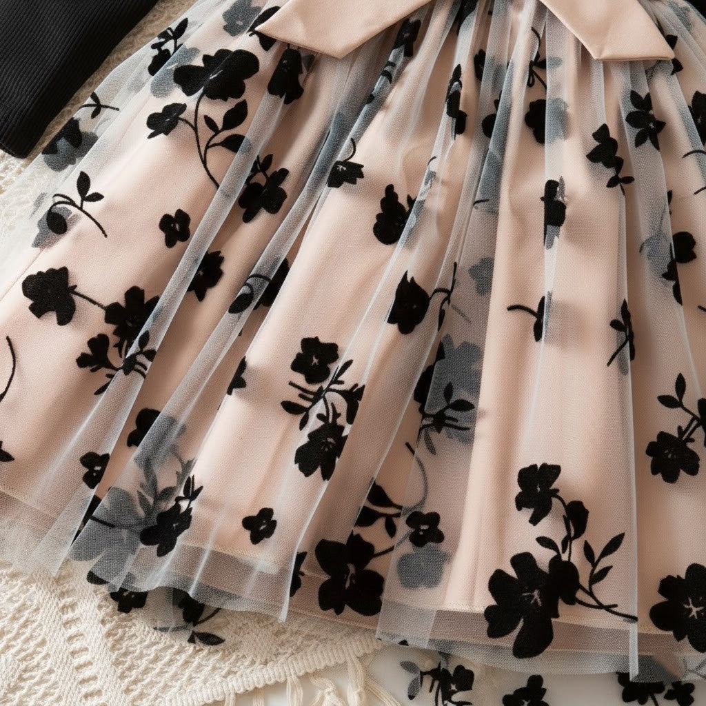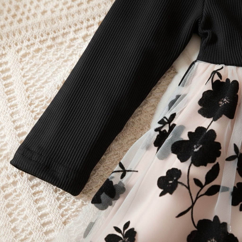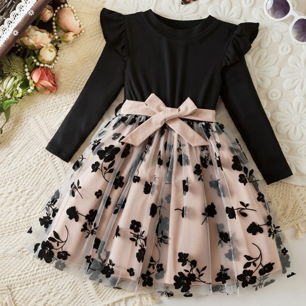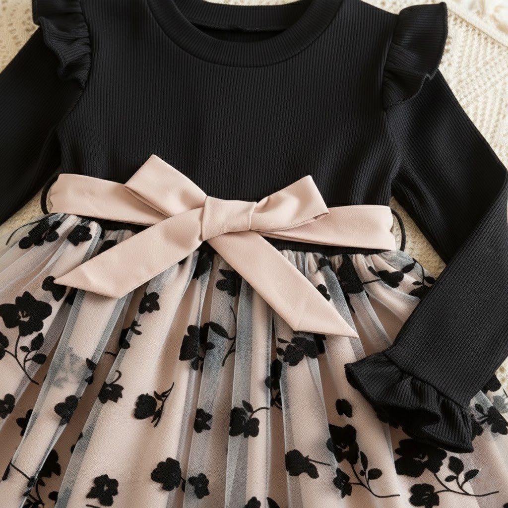 Denna rosé mesh-prinsessklänning är skapad för magiska ögonblick. Med sin sofistikerade färgkombination av djup svart överdel och mjukt roséfärgad meshkjol ger klänningen ett exklusivt och drömlikt intryck. Den luftiga tyllkjolen med diskret blommönster skapar ett vackert fall som rör sig graciöst vid varje steg. Perfekt för barn som älskar att känna sig extra speciella och klä sig som en riktig prinsessa.