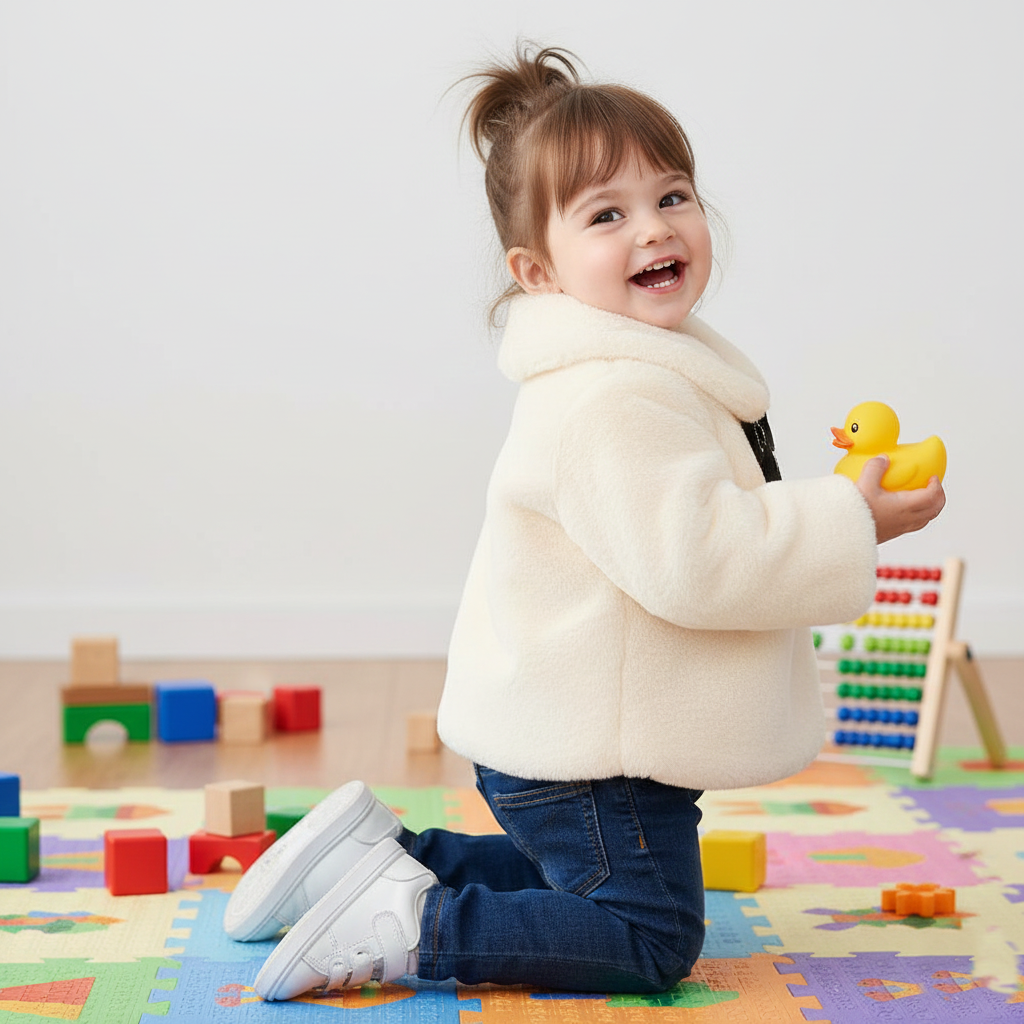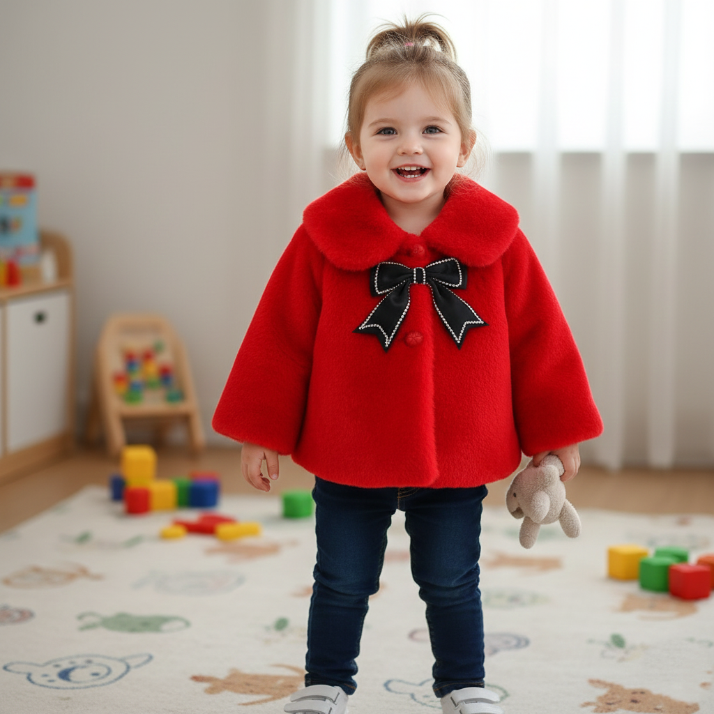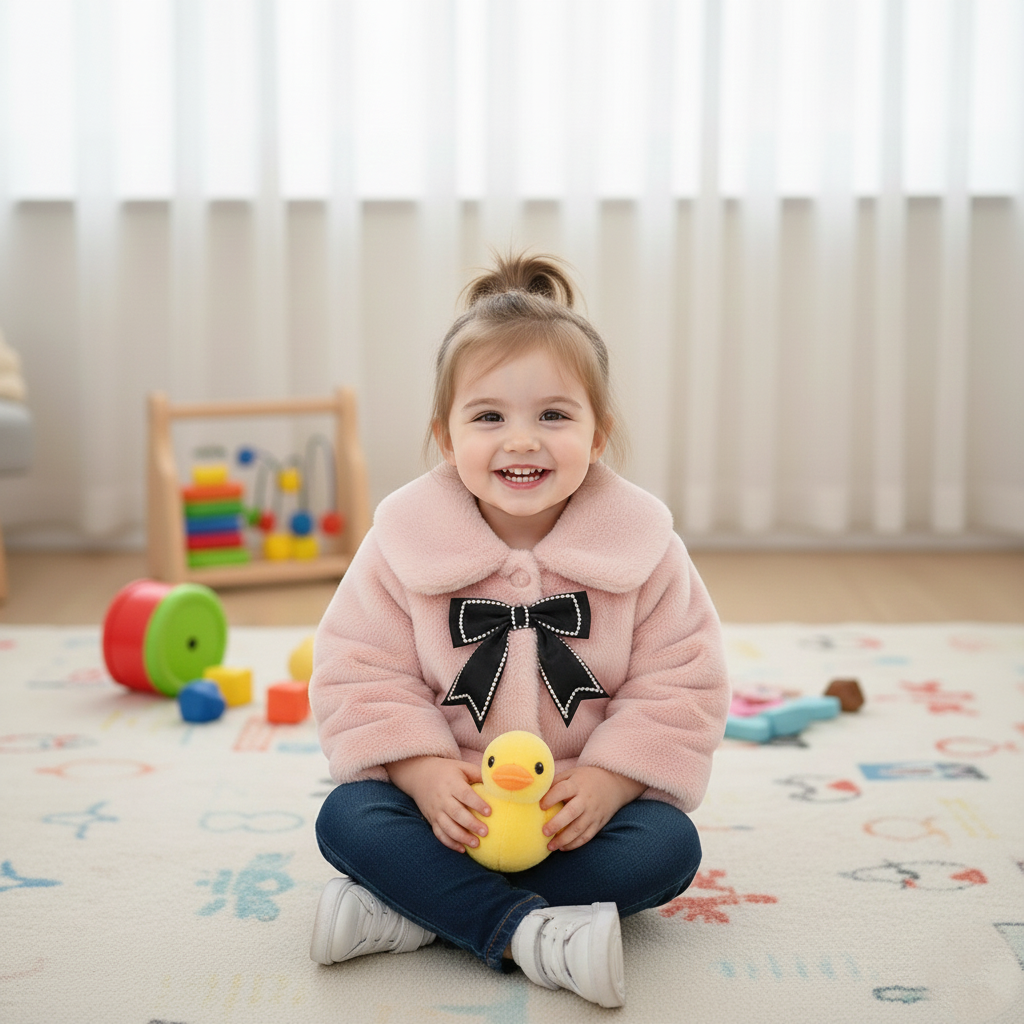 Denna tjej jacka kombinerar tidlös elegans med barnvänlig komfort. Den mjuka, fluffiga ytan ger en lyxig känsla samtidigt som den värmer skönt under kyliga dagar. Den ljusa färgen skapar ett rent och stilfullt uttryck som passar perfekt för både vardag och fest. En jacka som får ditt barn att känna sig speciell – varje gång den tas på.