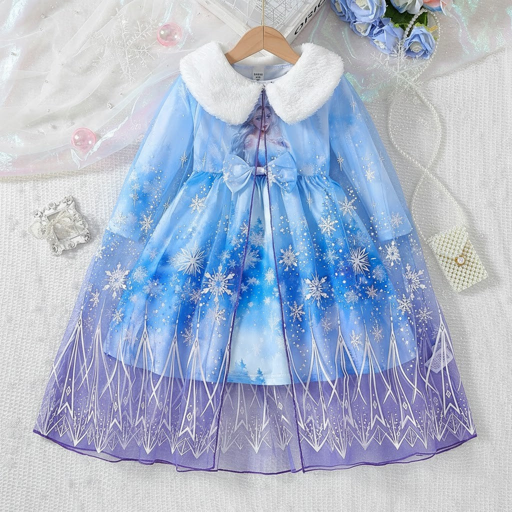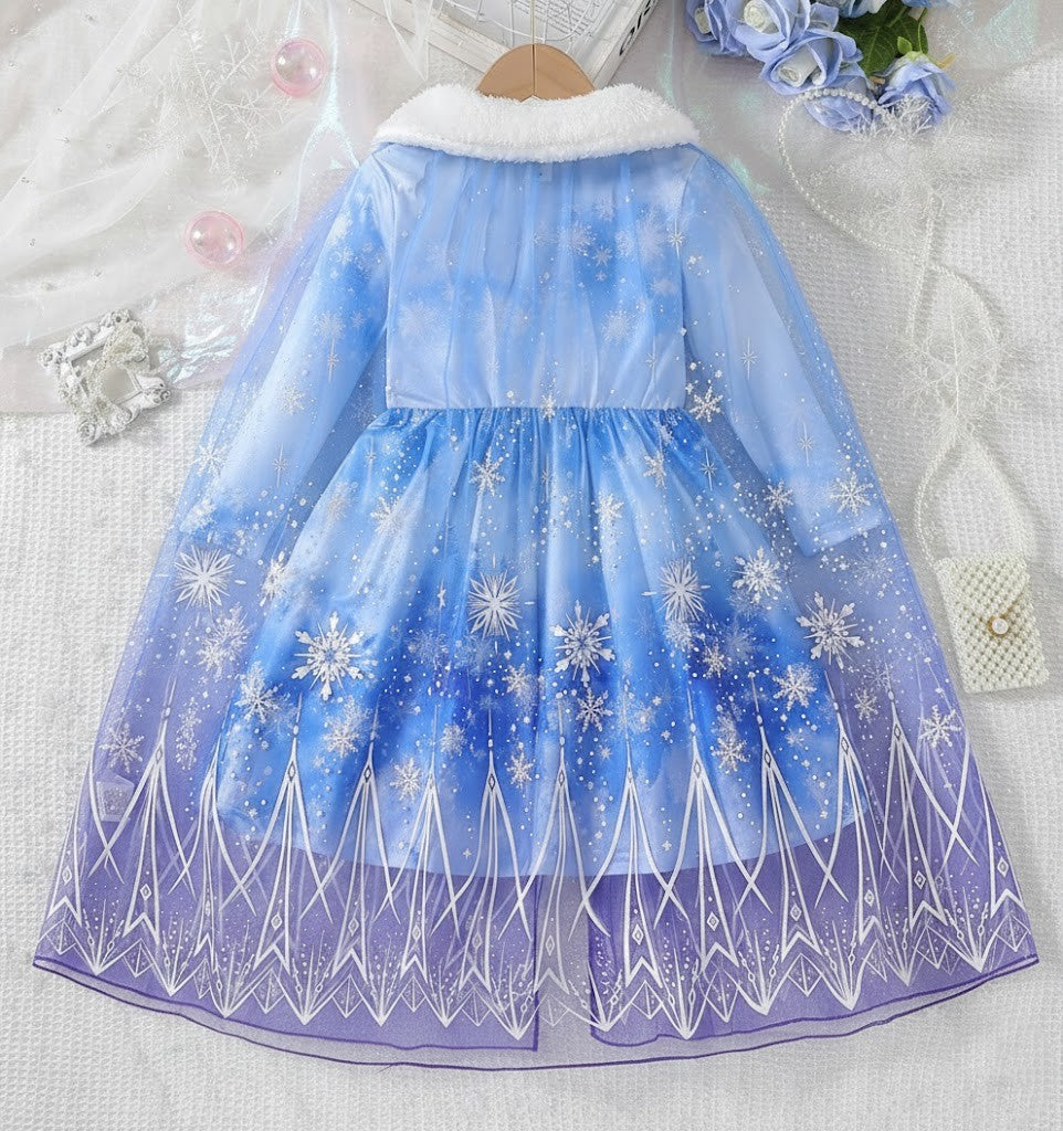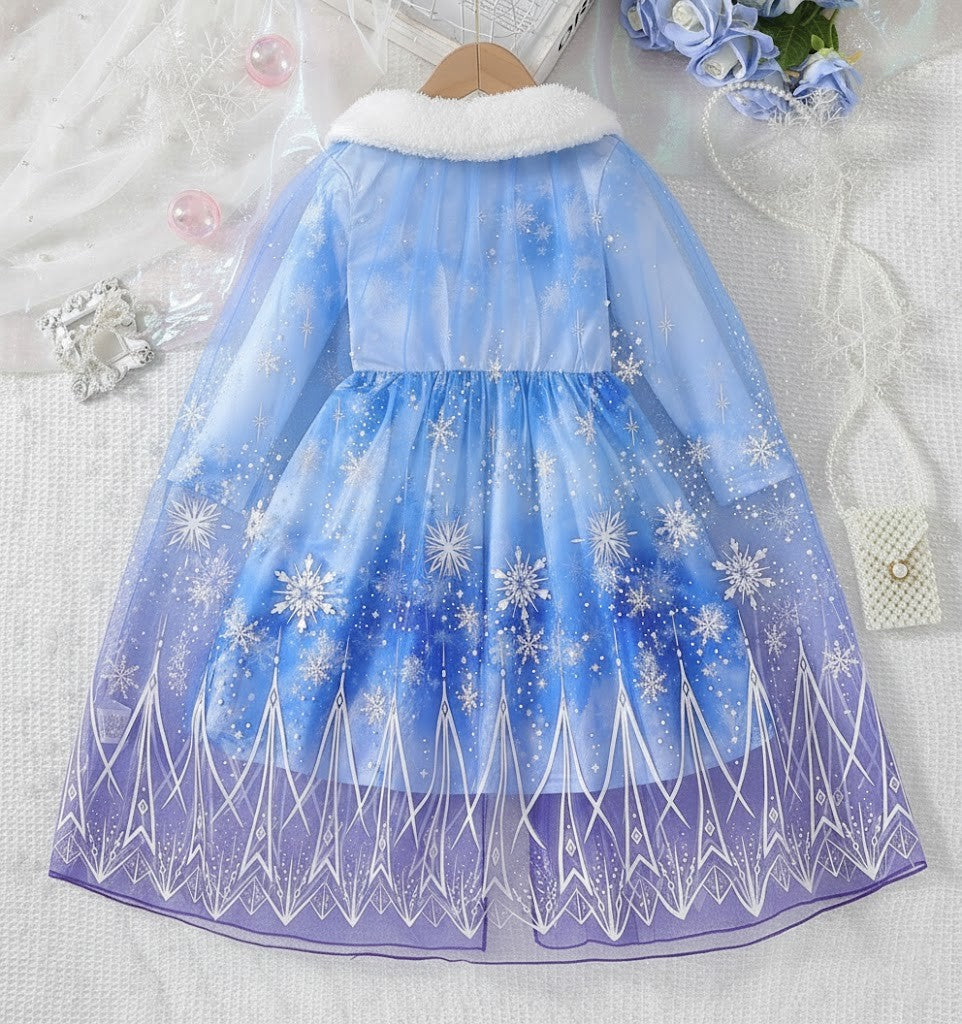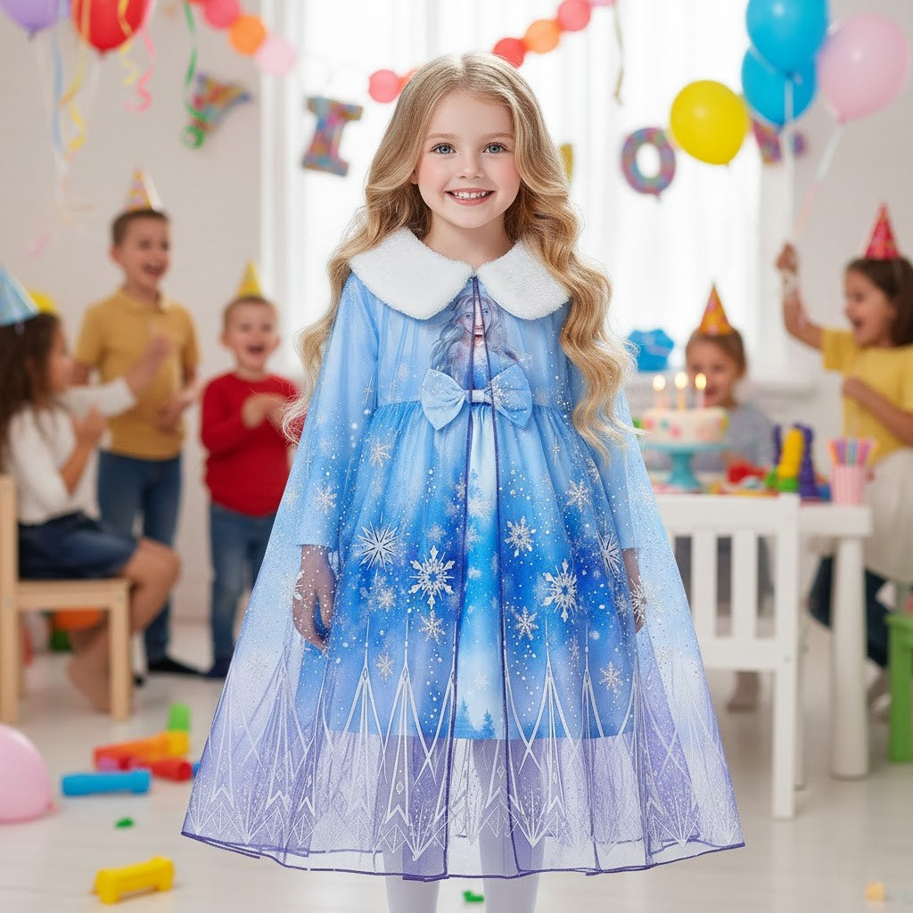 Denna tvådelade Snöprinsess-klänning med luftig tyllkappa är skapad för att väcka fantasin till liv. Med gnistrande snöflingemönster, mjuka frostblå nyanser och en elegant siluett känns varje steg som en dans i ett sagolandskap. Den fluffiga vita kragen ger en lyxig vinterkänsla, medan den genomskinliga kappan skapar ett svävande, drömlikt intryck. Perfekt för barn som älskar prinsessor, magi och äventyr – oavsett om det är kalas, lek eller högtid.