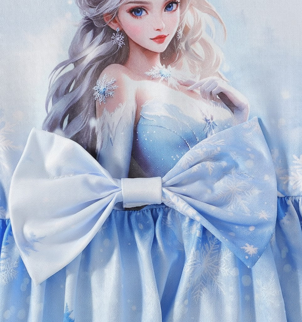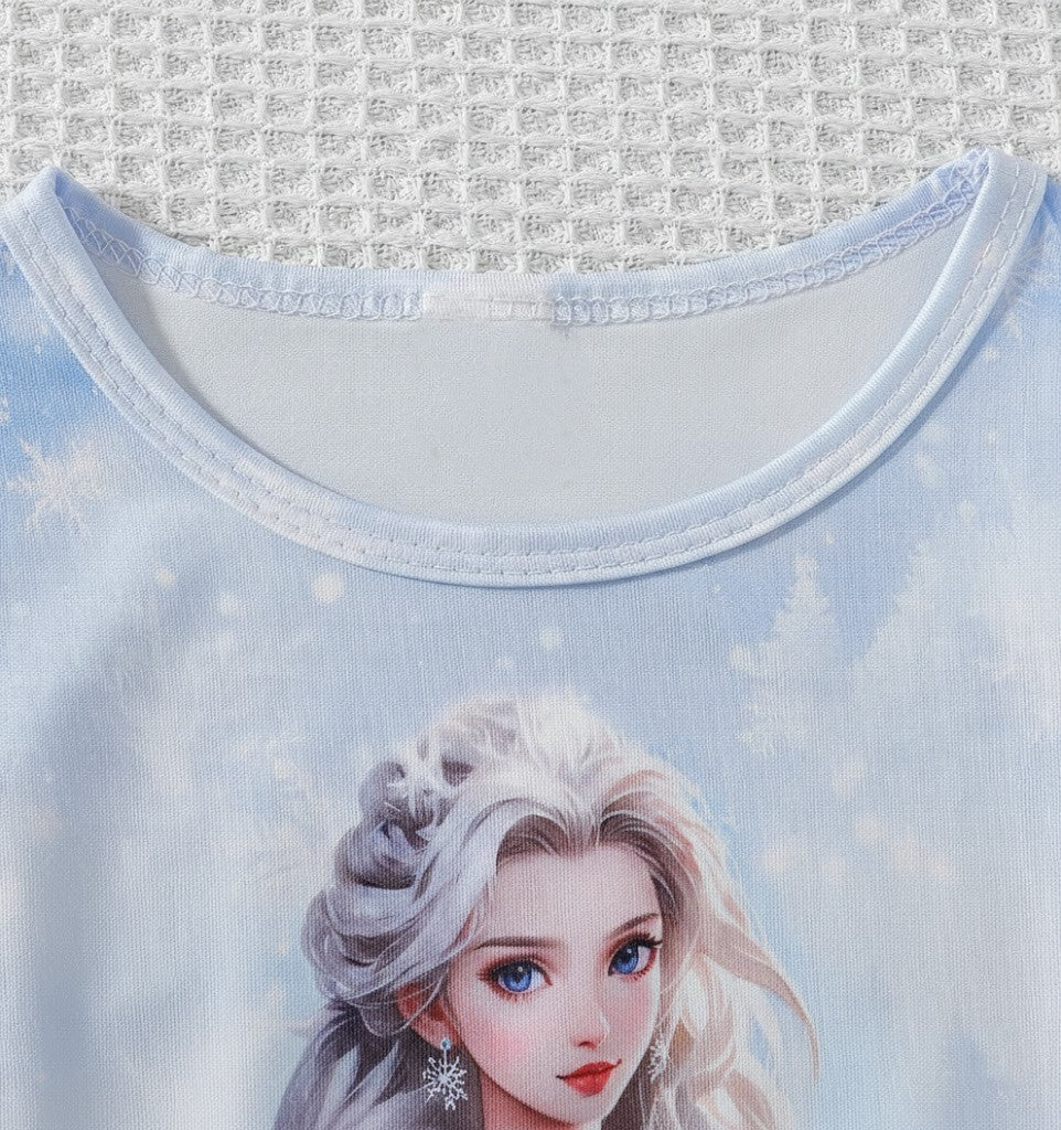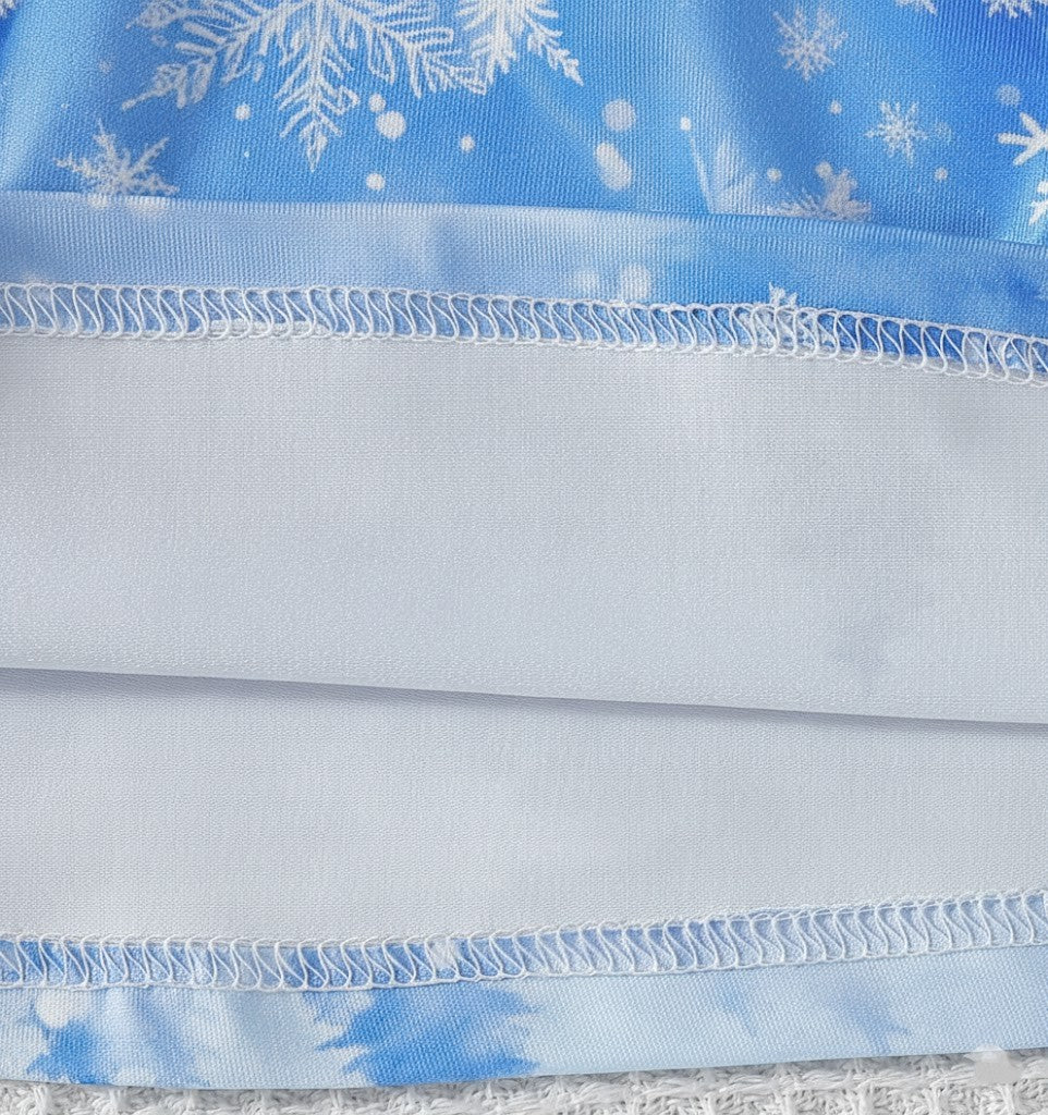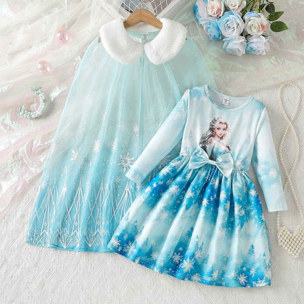Denna tvådelade Snöprinsess-klänning med luftig tyllkappa är skapad för att väcka fantasin till liv. Med gnistrande snöflingemönster, mjuka frostblå nyanser och en elegant siluett känns varje steg som en dans i ett sagolandskap. Den fluffiga vita kragen ger en lyxig vinterkänsla, medan den genomskinliga kappan skapar ett svävande, drömlikt intryck. Perfekt för barn som älskar prinsessor, magi och äventyr – oavsett om det är kalas, lek eller högtid.