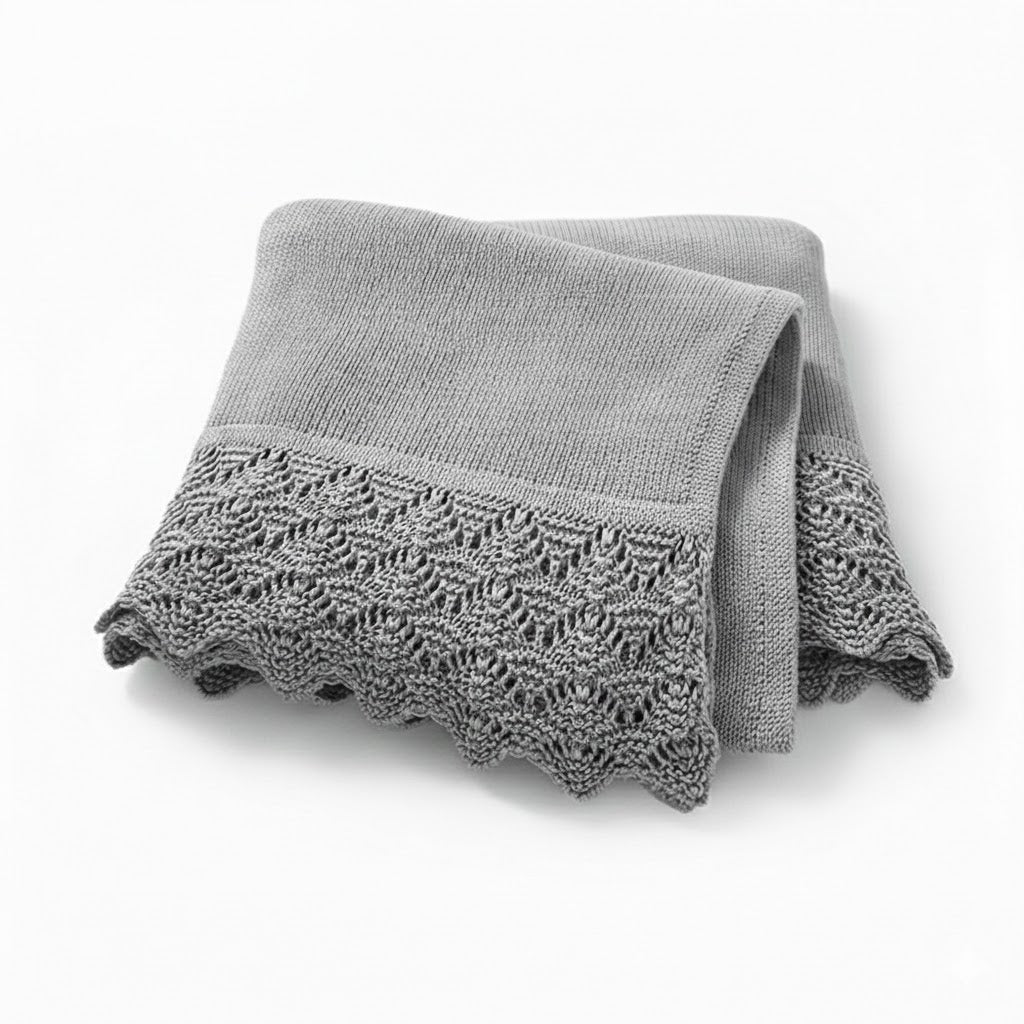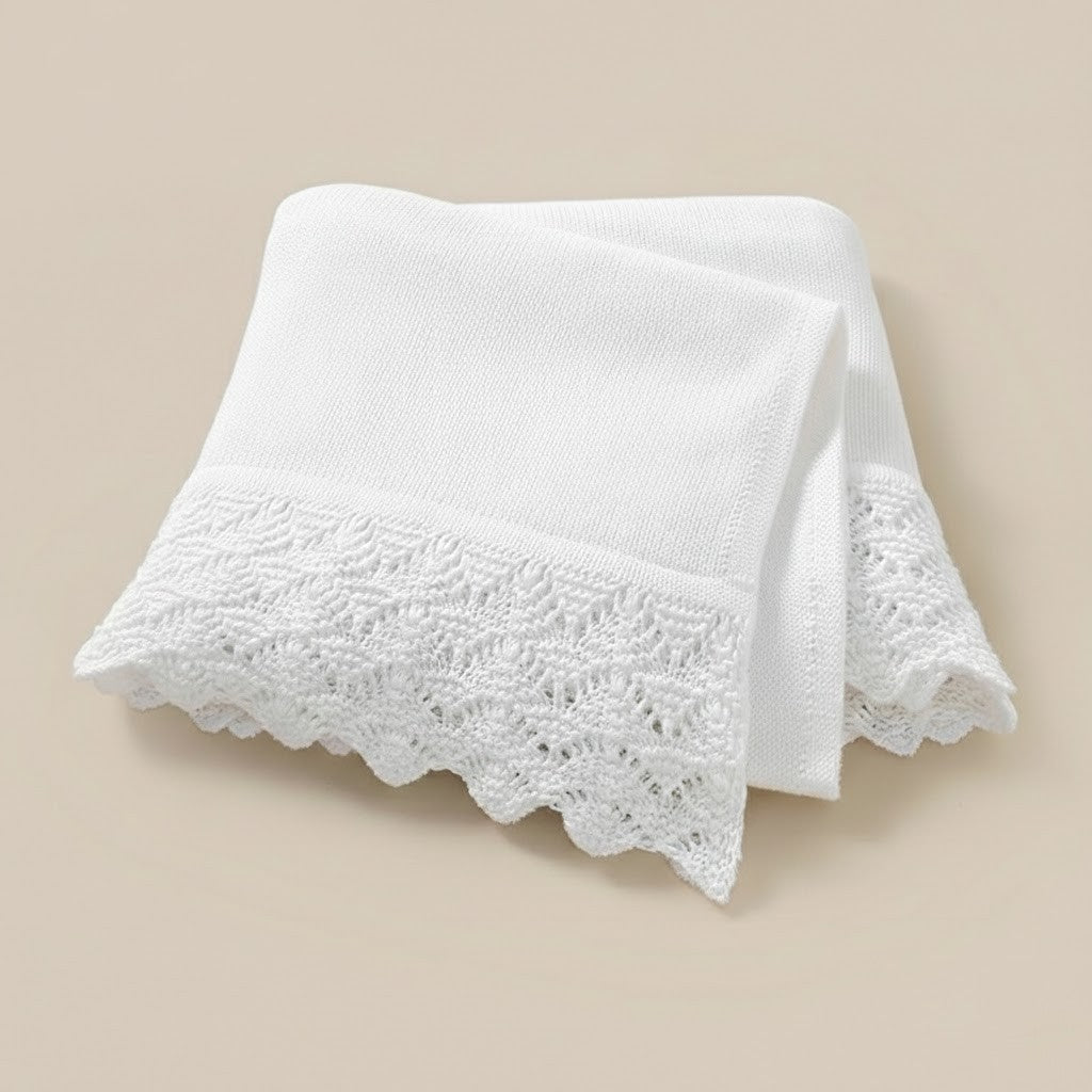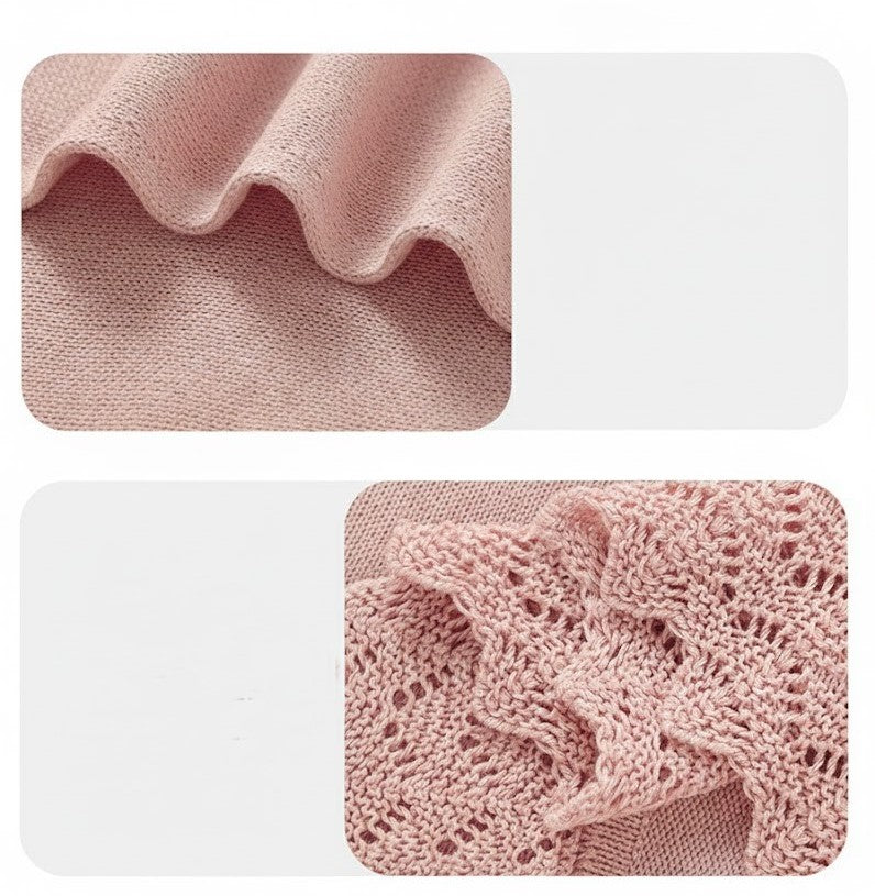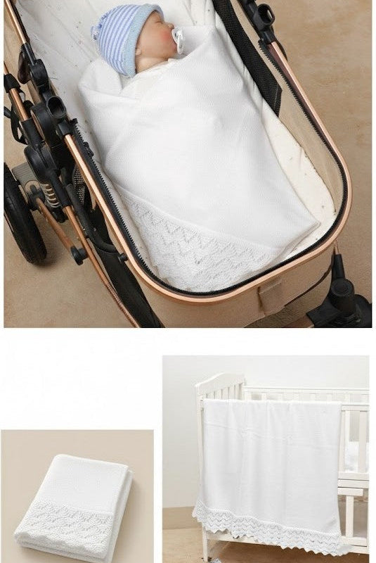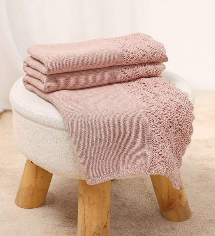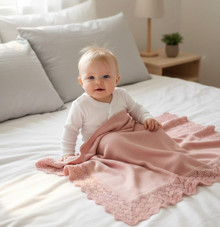 Den skickande babyfilten är skapad för att ge ditt barn en trygg, varm och ombonad känsla – precis som en mjuk kram. Med sitt luftiga stickade mönster och lena struktur omsluter filten barnet utan att bli för varm. Perfekt för nyfödda och små bebisar som behöver både komfort och andningsförmåga, oavsett om det är i vagnen, sängen eller famnen.